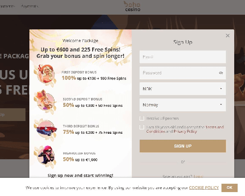 Førstegangsbesøkende på Boho Casino kan ta en velkomstpakke som inkluderer opptil €600 og 225 gratisspinn etter å ha gjort sine tre første innskudd. Et minimumsinnskudd på €20 kreves for hver komponent i pakken. Du vil få 100 gratisspinn på toppen av en 100 % matchbonus opptil €100 på ditt første innskudd. Du vil motta en 50 % bonus opptil €300 pluss 50 gratisspinn på ditt andre innskudd, og en 75% bonus opptil €200 pluss 75 gratisspinn på ditt tredje.